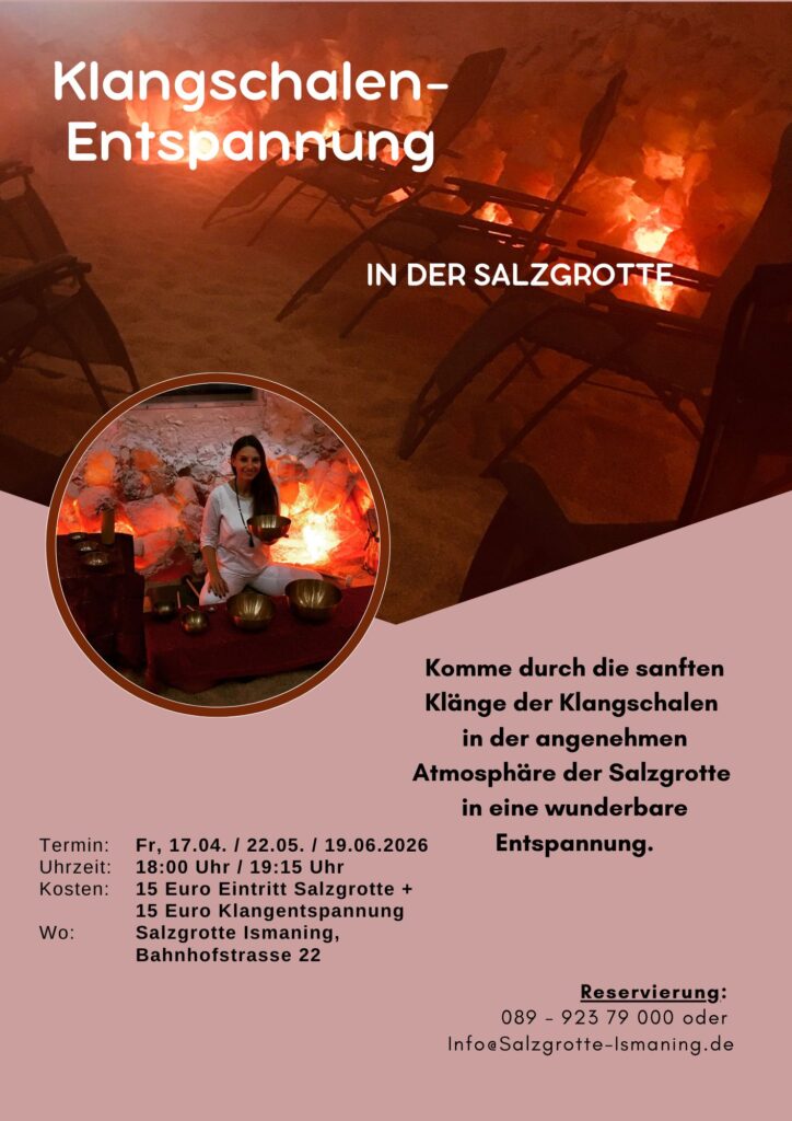 Einmal im Monat, immer freitags, können Sie die geführte Klangschalen-Meditation und/oder das meditative Klangkonzert in der Salzgrotte Ismaning erleben. Gönnen Sie sich Zeit für sich und erlauben Sie sich, sich selbst zu stärken, bewusst zu entspannen, zur Ruhe zu kommen um kraftvoller den Belastungen des Alltags gewachsen zu sein. In der Regel einmal im Monat, eine Stunde, jeweils um 18:00 Uhr und um 19:15 Uhr.